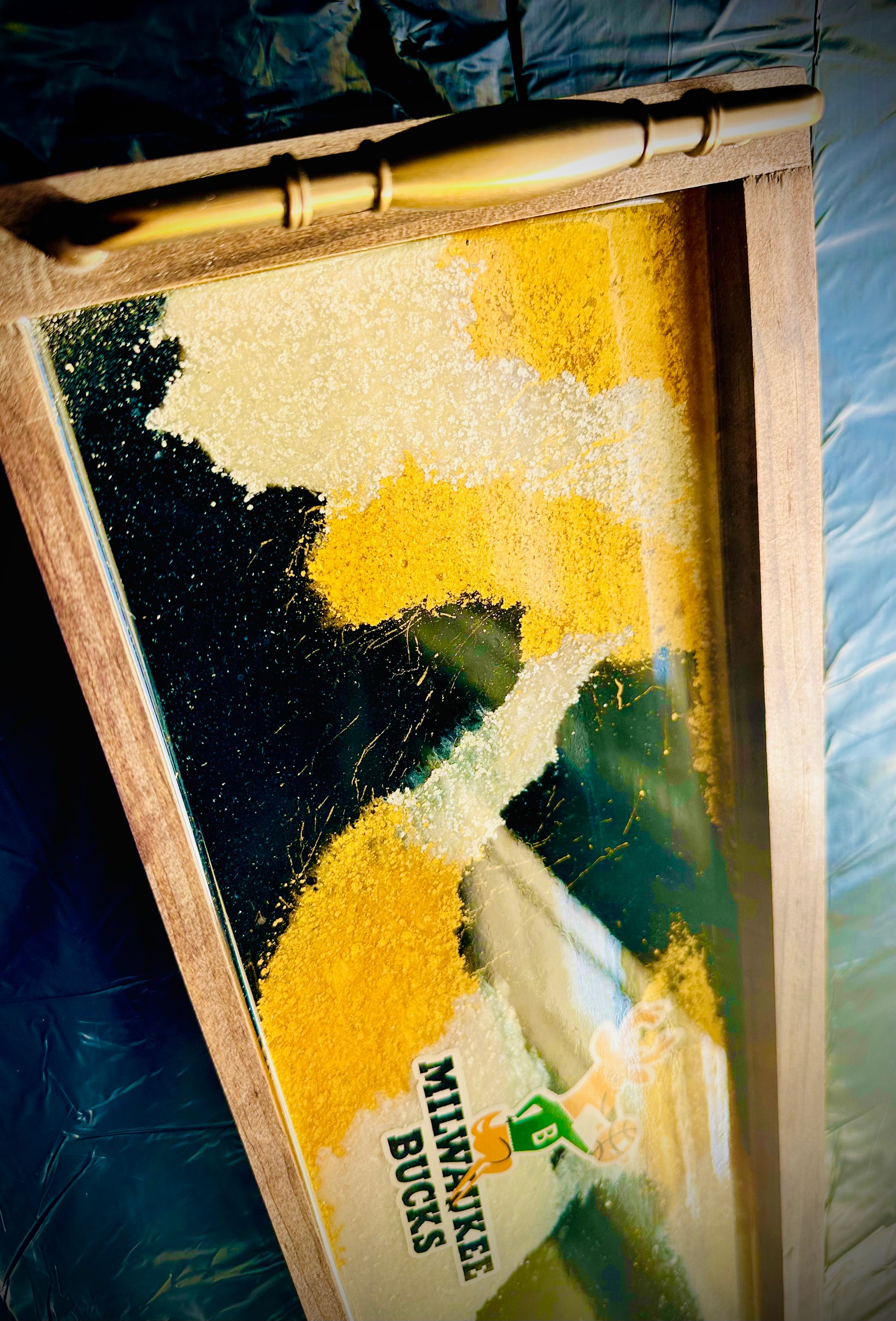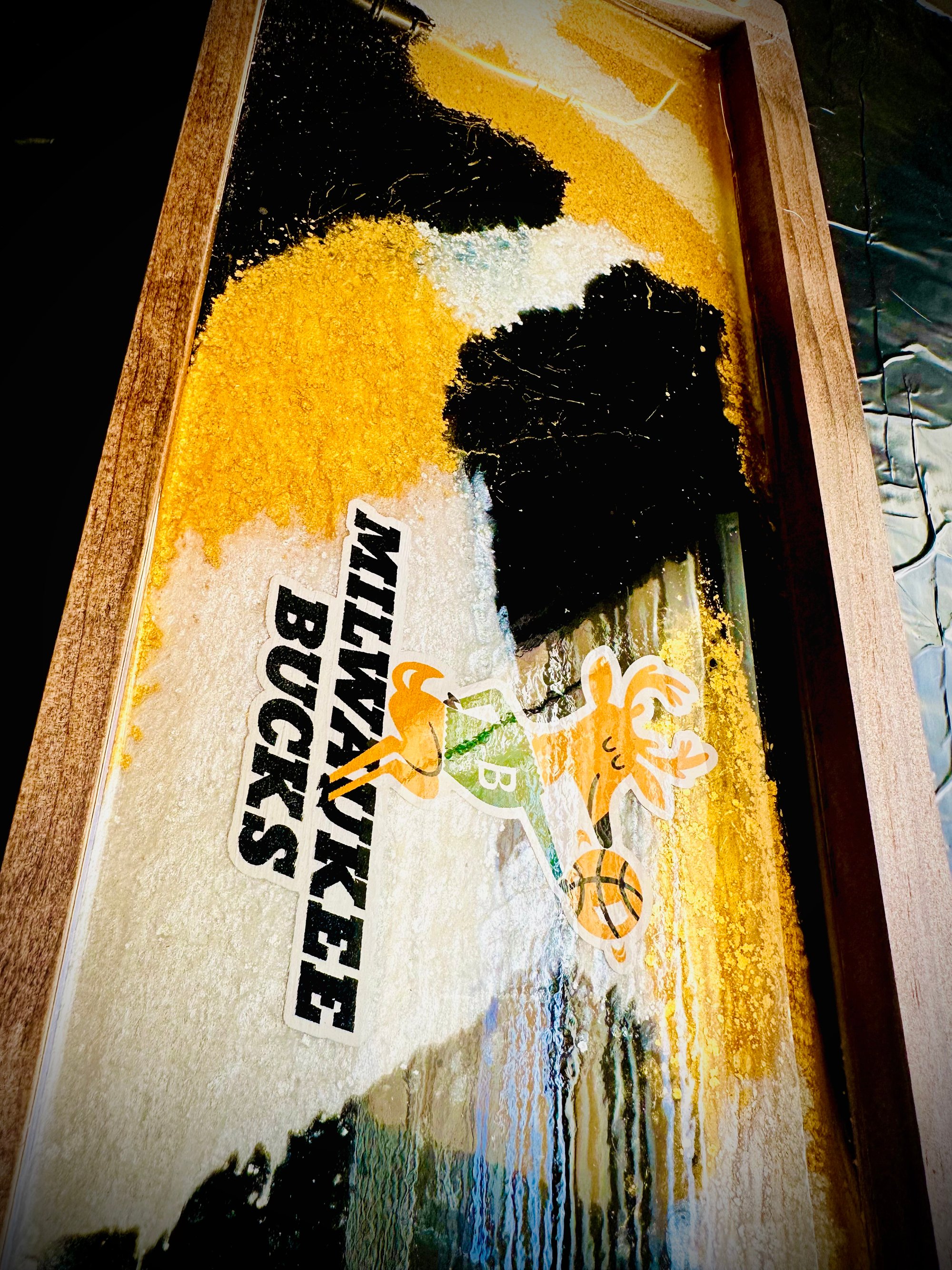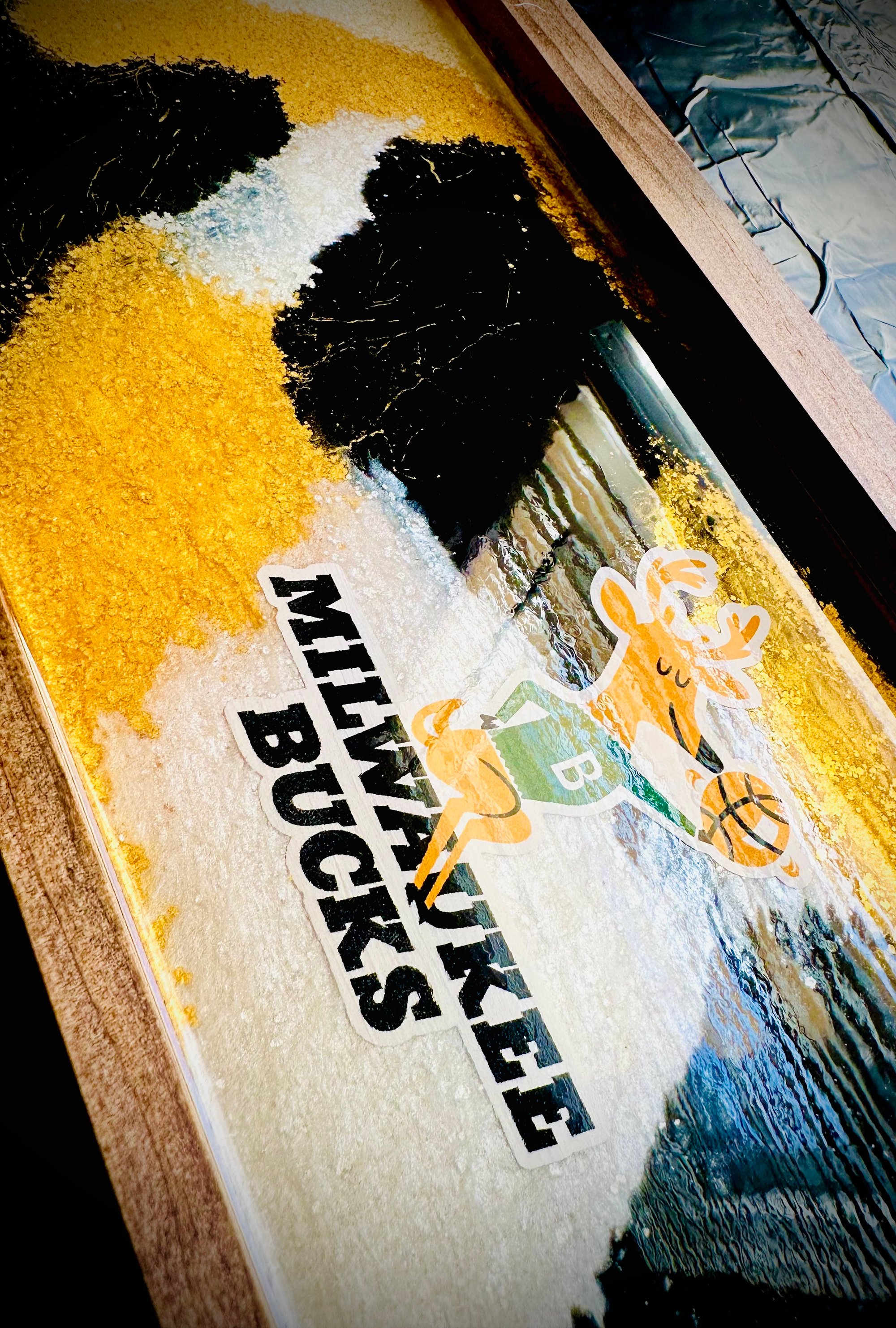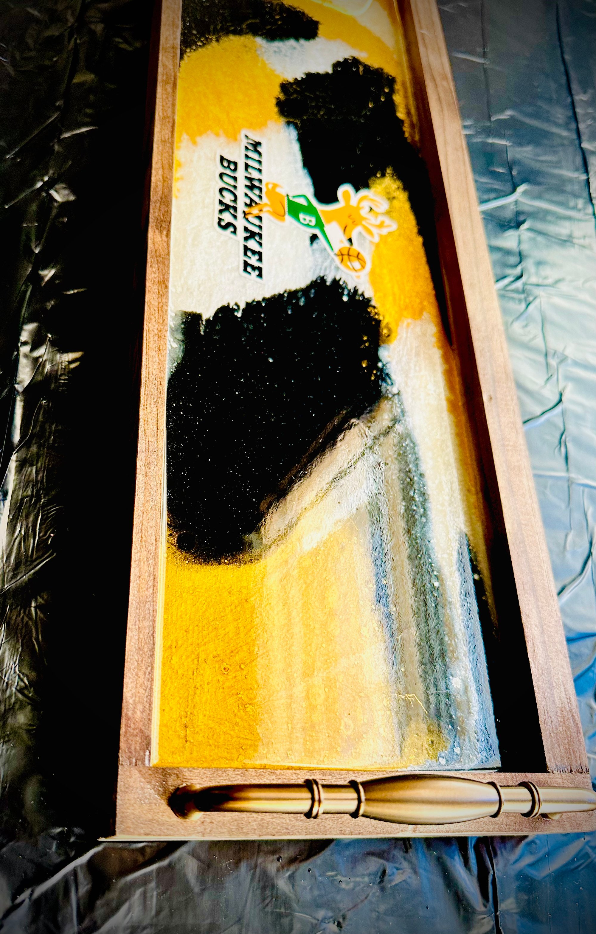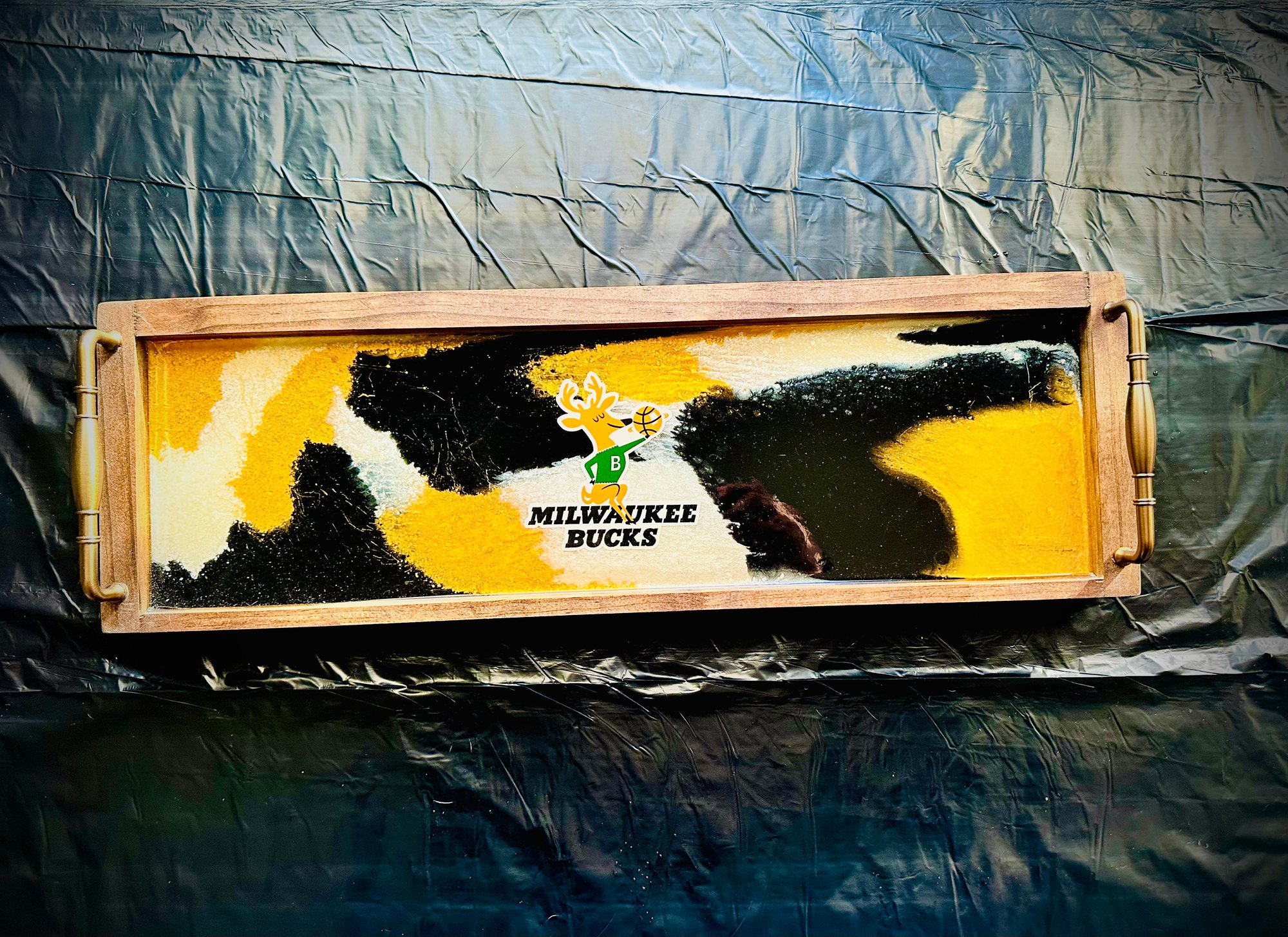 "Elevate your basement home decor with this sleek, old-school Milwaukee Bucks epoxy tray! Featuring the iconic Bucks logo in a striking black, gold, and white color scheme, this tray adds a touch of vintage cool to any space. Not just for serving, this piece is waterproof and hangable, making it a versatile addition to your wall decor or bar area. Perfect for showcasing your team pride or adding a unique touch to your home, this tray is a must-have for any true Bucks fan. Get yours today and bring a piece of Milwaukee basketball history to your home!"