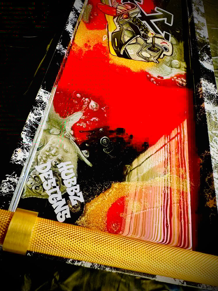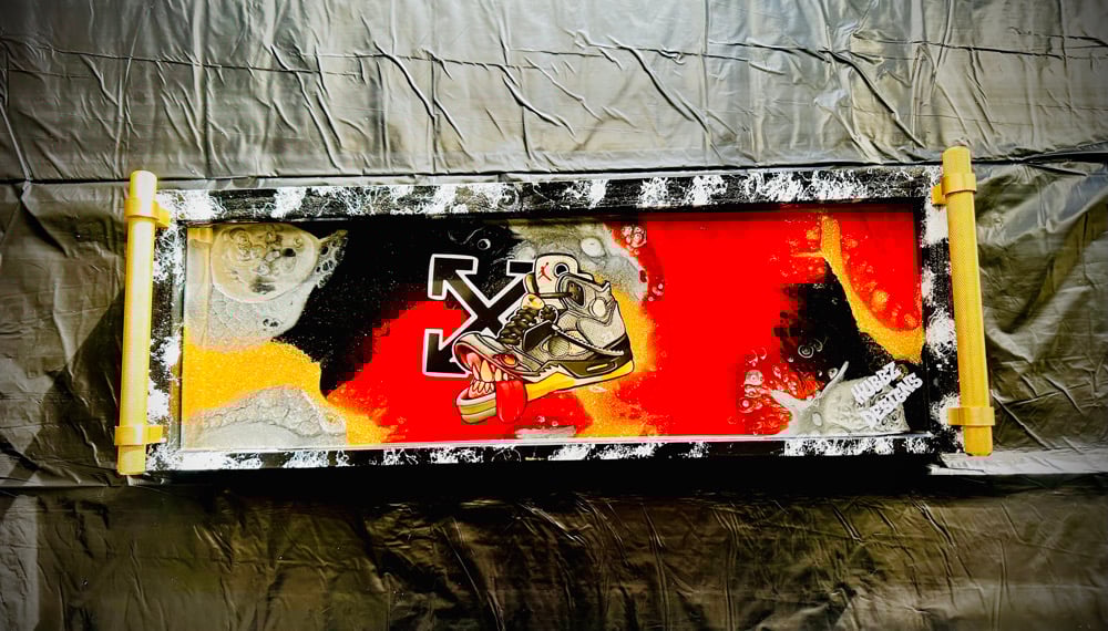 "Step up your sneaker game with this custom Off-White Jordan 5-themed tray! Featuring a vibrant red, gold, black, and white background, this tray is a must-have for sneaker lovers and collectors. The gold handles add a touch of luxury, while the iconic Off-White design pays homage to the legendary Jordan 5. Perfect for displaying your favorite sneakers, serving snacks at a sneaker-themed party, or as a stylish addition to your home decor, this tray is a unique way to showcase your passion for sneaker culture. Don't miss out on this limited edition piece that blends art, fashion, and functionality!"