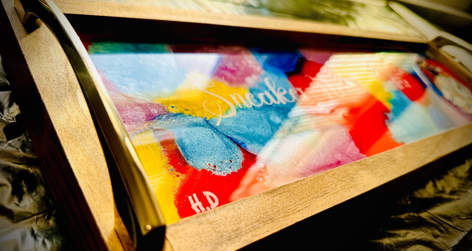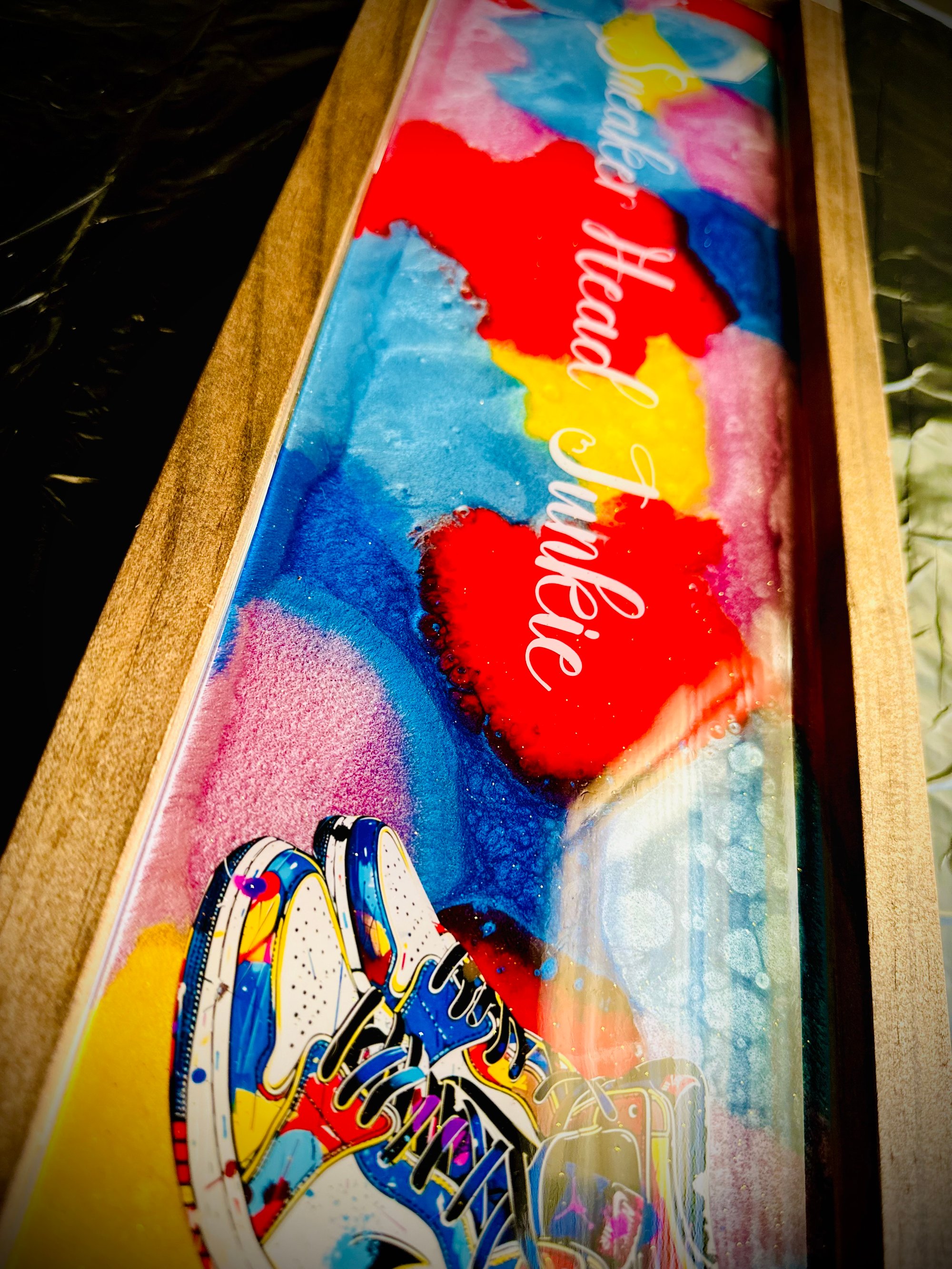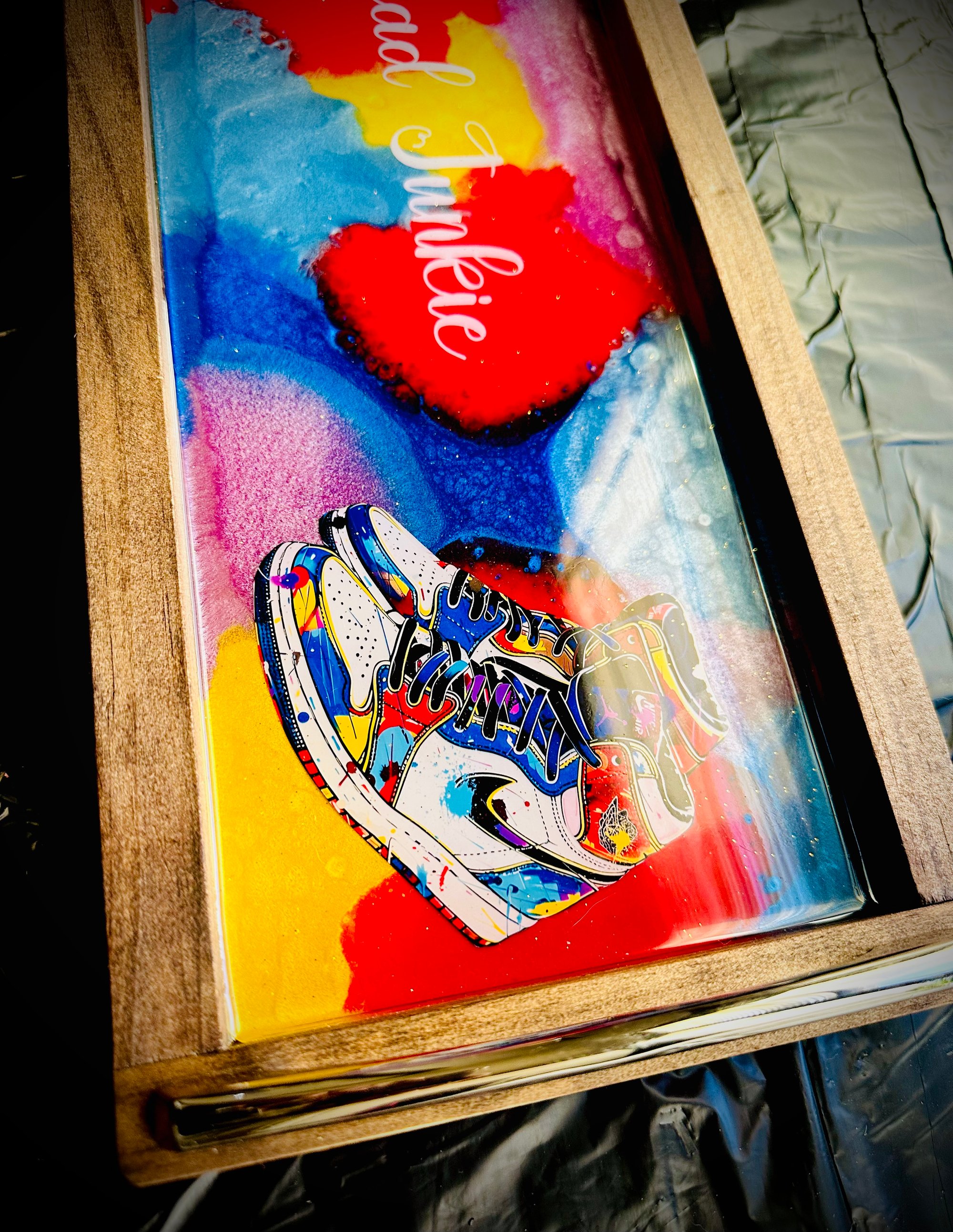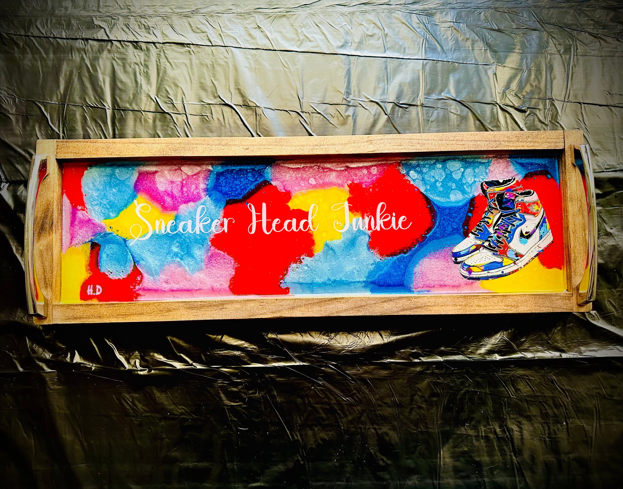 "Step up your home decor game with this vibrant, handcrafted epoxy tray! Perfect for sneaker enthusiasts and anyone with a flair for style, this colorful tray features a unique design with a pair of eye-catching high-top sneakers. The words 'Sneaker Head Junkie' are elegantly scripted across the design, making it a must-have for collectors and fans alike. Finished with sleek chrome handles, this tray is not only a statement piece but also a functional addition to any room. Whether you're serving up drinks, displaying your favorite collectibles, or just adding a pop of color to your space, this tray is sure to turn heads. Get yours today and showcase your passion for sneakers and style!" vibrant, handcrafted epoxy tray! Perfect for sneaker enthusiasts and anyone with a flair for style, this colorful tray features a unique design with a pair of eye-catching high-top sneakers. The words 'Sneaker Head Junkie' are elegantly scripted across the design, making it a must-have for collectors and fans alike. Finished with sleek chrome handles, this tray is not only a statement piece but also a functional addition to any room. Whether you're serving up drinks, displaying your favorite collectibles, or just adding a pop of color to your space, this tray is sure to turn heads. Get yours today and showcase your passion for sneakers and style!"