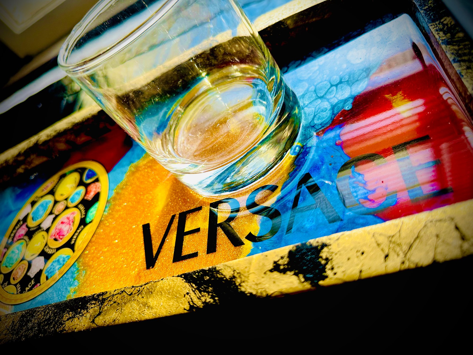 "Elevate your everyday essentials with this Versace-themed tray! Featuring a striking rectangular design with a luxurious gold border and a vibrant mix of red, yellow, blue, and gold colors, this tray adds a touch of opulence to any space. Adorned with the iconic "VERSACE" logo in bold black and a central circular design showcasing a variety of colorful coins. It's a statement piece that exudes sophistication. Perfect for organizing your watches, colognes, or other personal items, this tray combines functionality with high-end style. Whether you're a fashion aficionado or simply appreciate the finer things in life, this Versace tray is a must-have accessory for your home."